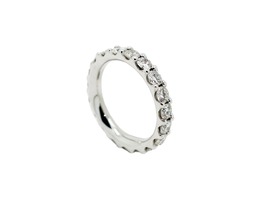 Alliance Benoit Joaillier en or blanc 750/1000e, sertie en tour complet de diamants taille ronde en serti sans filet. Intérieur de l'anneau bombé, très confortable.