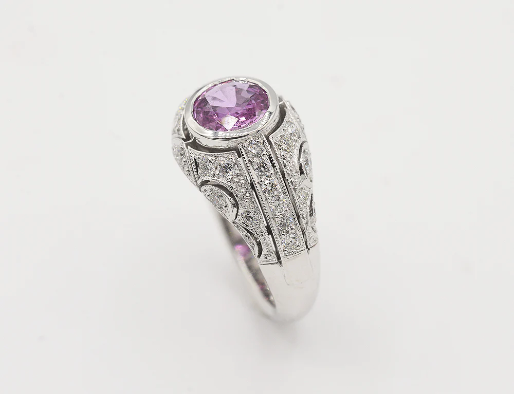 Bague Création en or blanc 750 millièmes sertie de diamants inspirée de l'Art Déco. Ornée en son centre d'un Saphir rose de Ceylan en clos, entouré de différents volumes et arabesques entièrement sertis de diamants. Corps de bague épais en demi jonc.