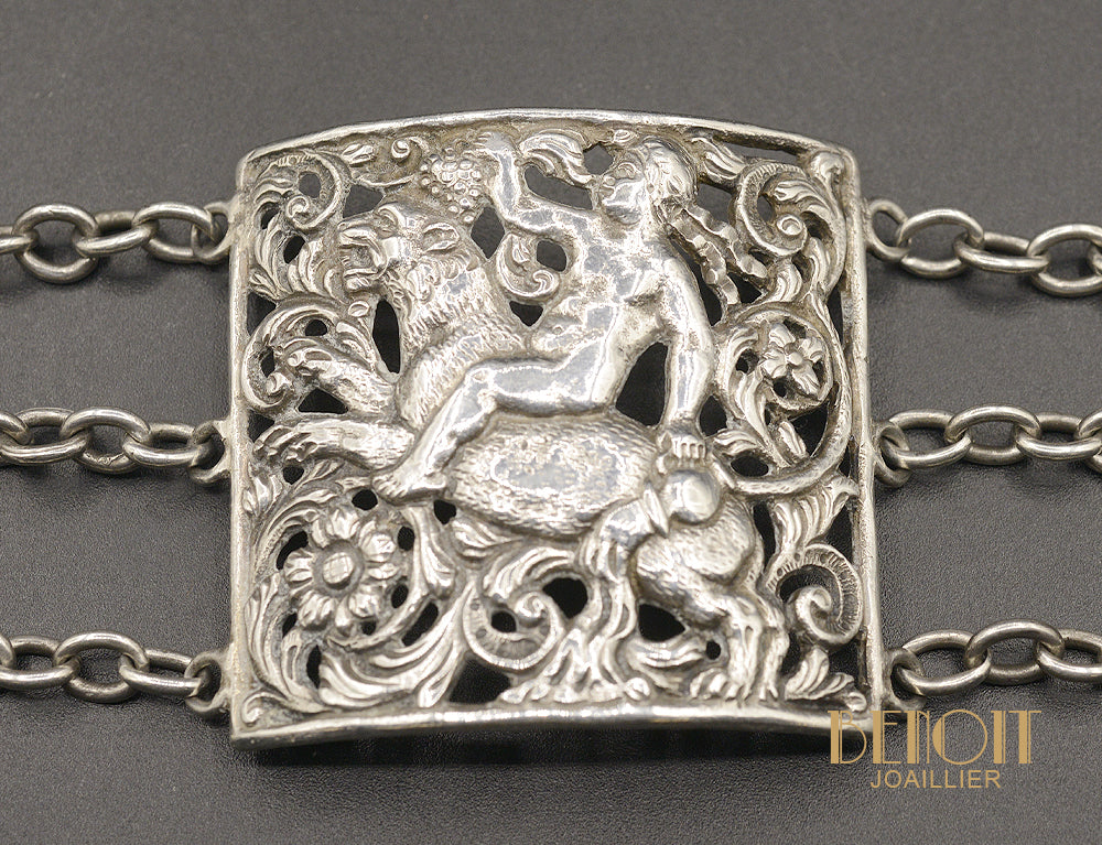 Bracelet manchette en argent massif, composĂ© de deux plaques carrĂ©es, de taille identique, reliĂ©es entre elles et aux dispositifs de fermeture par trois chaĂźnettes, dĂ©cor richement travaillĂ©, reprĂ©sentant, un nu masculin, chevauchant une lionne sur fond de vĂ©gĂ©tation profuse. Fermoir Ă cliquet épaulĂ© par deux huit de sĂ©curitĂ©. PrĂ©sence d'une signature : H Dubret. Peut ĂȘtre vendu avec le bracelet assorti, rĂ©fĂ©rence A10702.