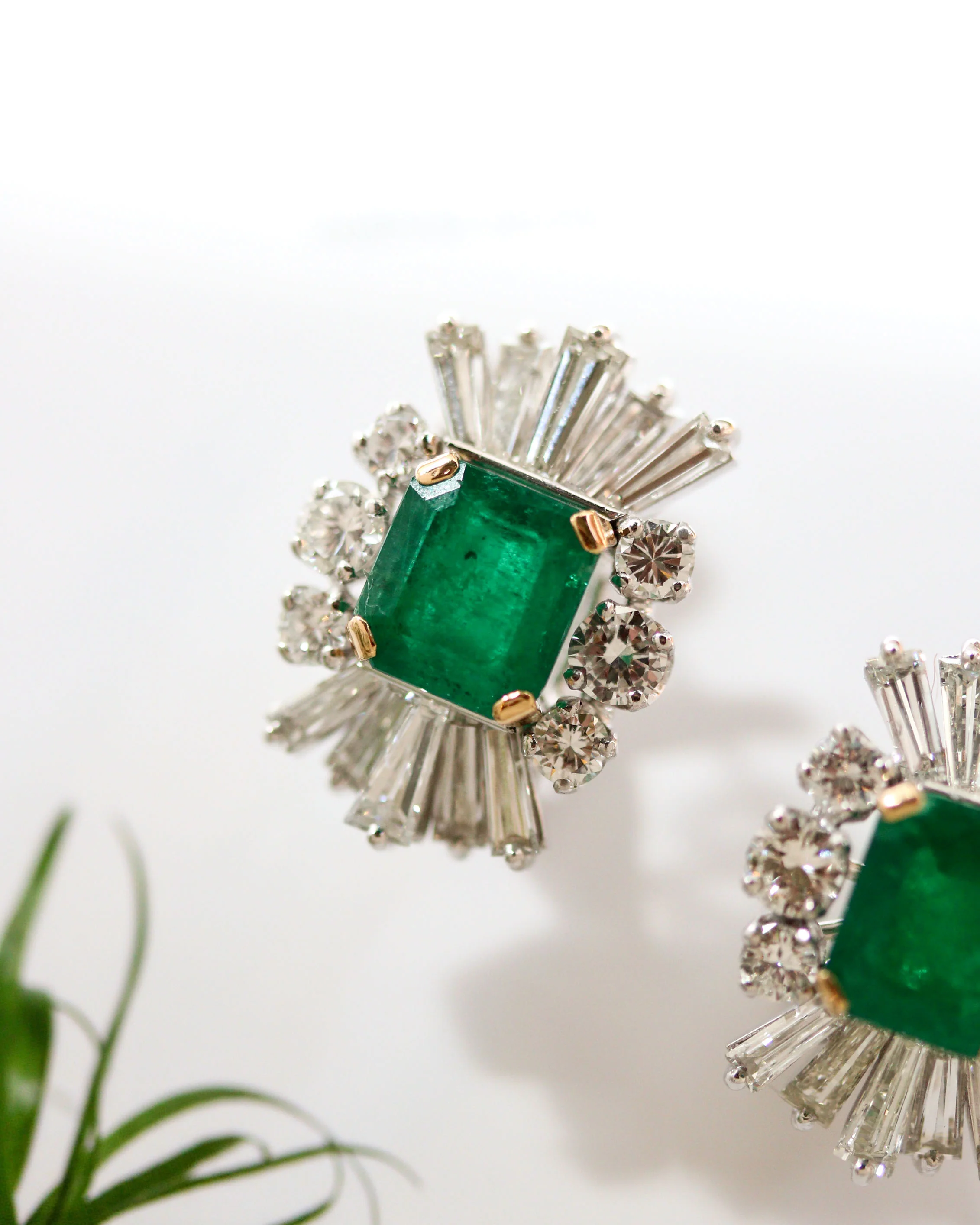 - Pierres par boucle : Emeraude 2 x ~2.8ct ; 6 diamants ronds ~0.78ct au total ; 10 Diamants trapèze ~1.30ct au total